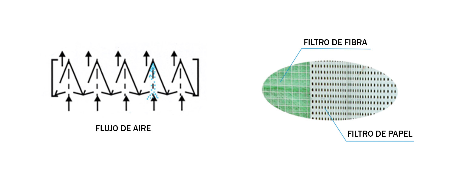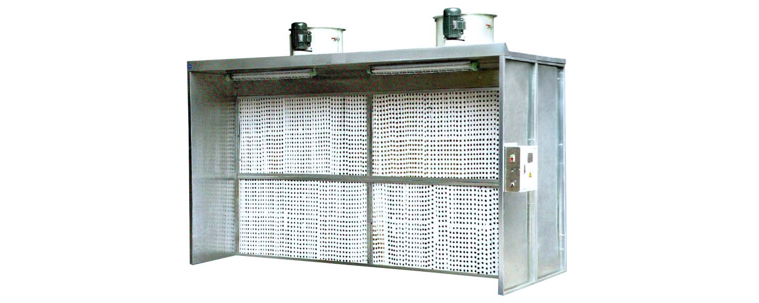 Cabinas de pintura en seco de bajo mantenimiento. Apropiadas para pintura continua de piezas también de grandes dimensiones, con ventiladores dotados de aspas contrarias de elevado rendimiento en versión antichispa. Disponible también con paredes y techo prolongados (versión B) que optimizan la velocidad de captación a la distancia de 1 m del frente aspirante. Suministradas de serie con lámpara y de filtro de papel: ulterior fase filtrante de fibra de vidrio disponible por encargo.